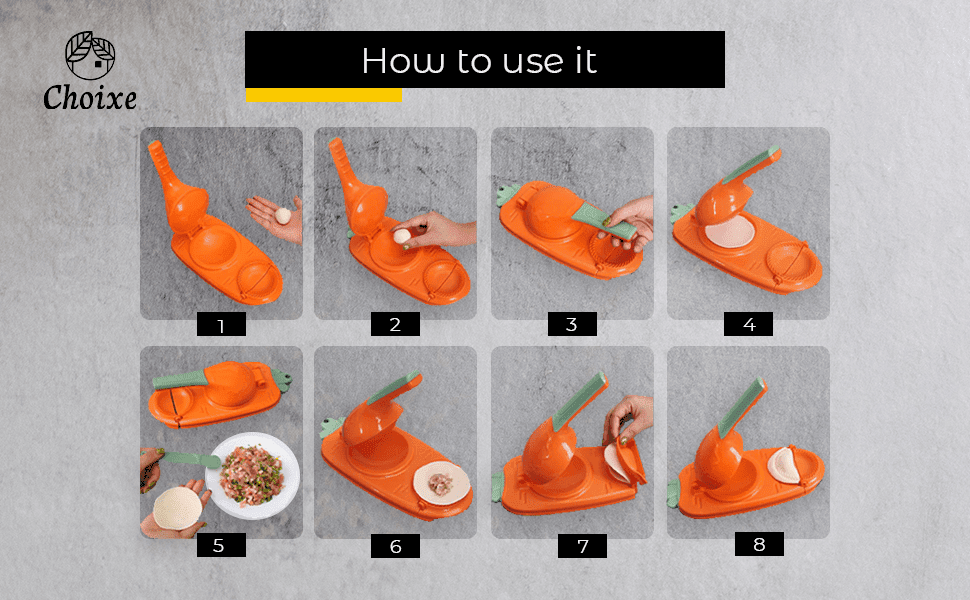 Easy-to-use. Put the dough on the dumpling maker set; pull down the handle and press the dumpling/empanada wrapper. Add your favorite fillings on the dumpling skin; then close the pressing mold to get a perfect piece.