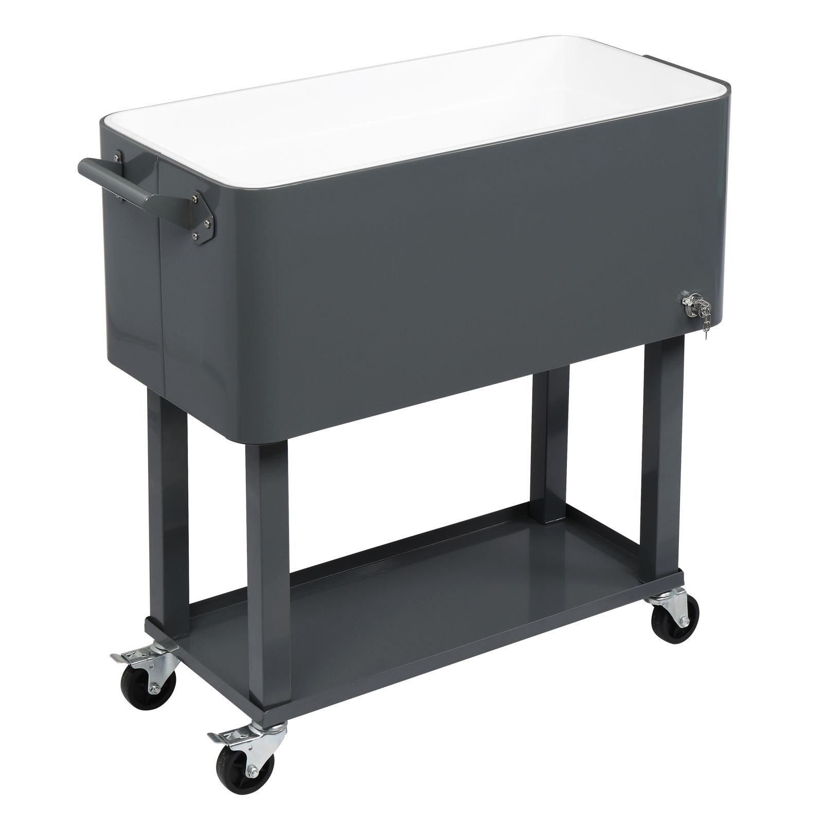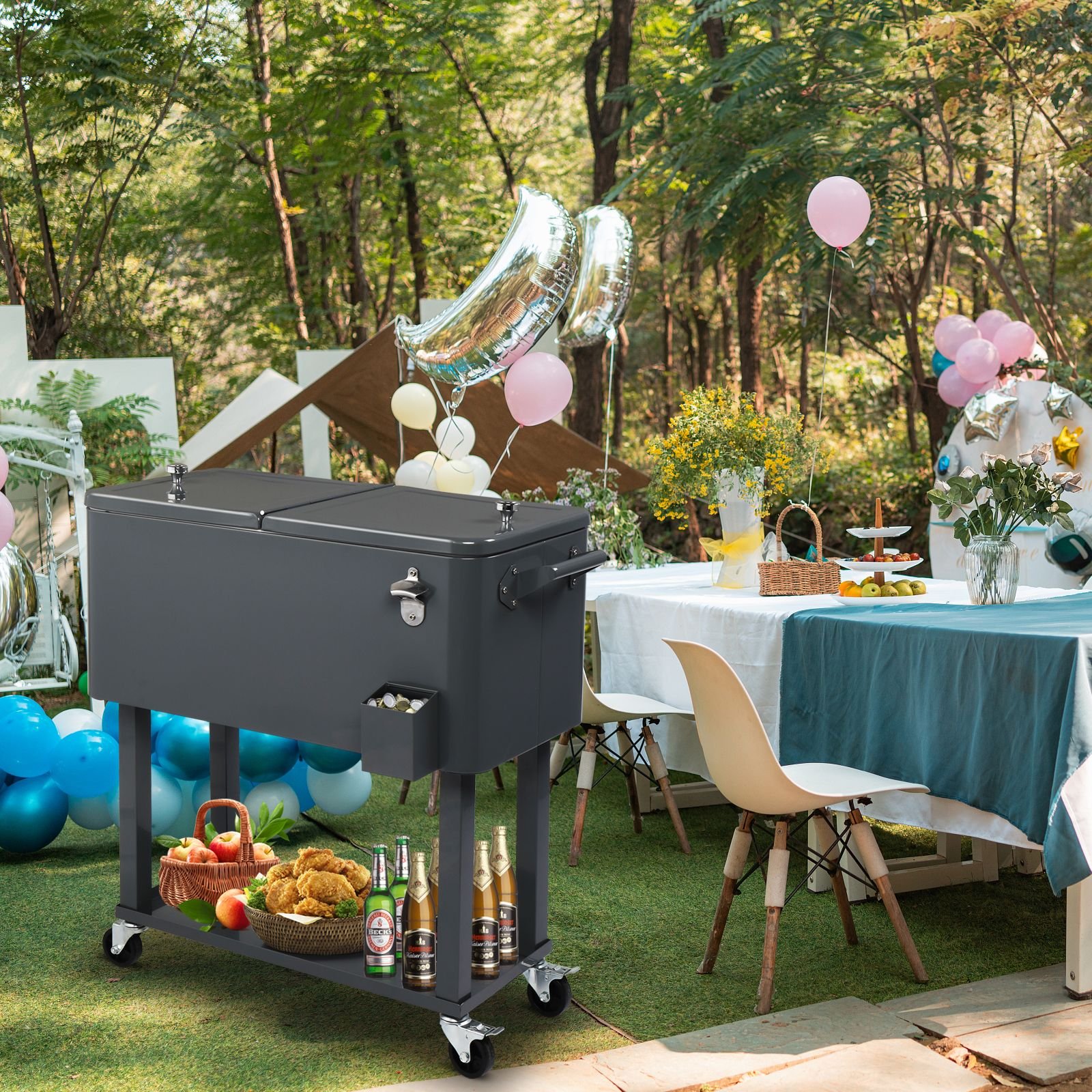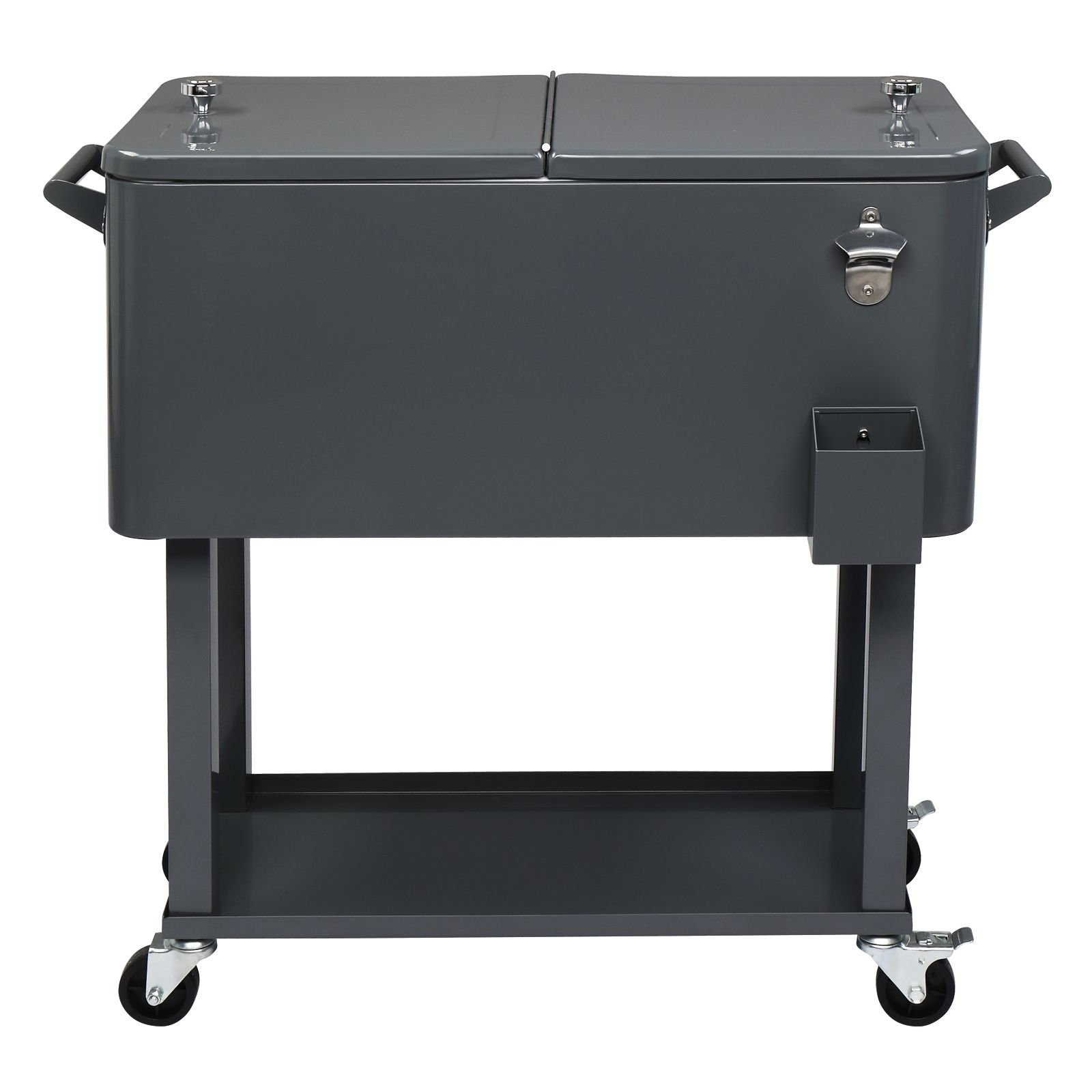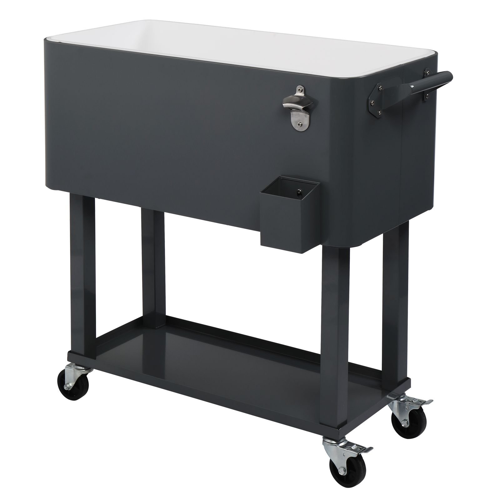 Level up your outdoor events with an all-in-one cooler cart! Fit all the cool refreshments you need with a large, 80-quart fill capacity, and the lower shelf provides extra space for extra beverages or other items you wish to store. Its insulated basin keeps your beverages cold for multiple hours with its injected molded insulation technology. The bottle opener and cap catcher help you easily remove and collect the caps, and the sturdy wheels provide easy mobility when the cooler is full with its locking casters. The drainage cap make it so convenient to clean up the cooler in a nap. Entertain yourself and your guests with this beautiful and high-quality rolling cooler cart!