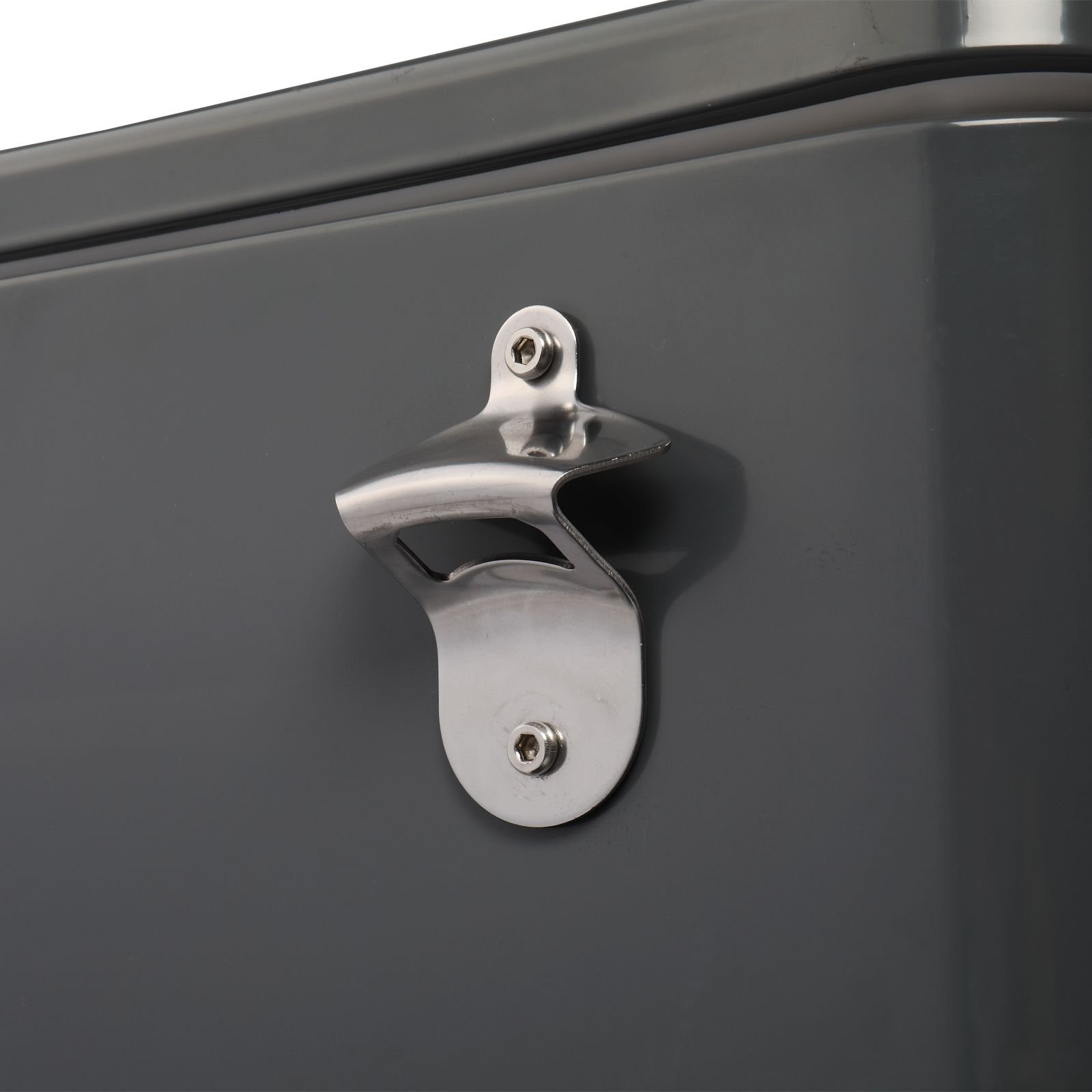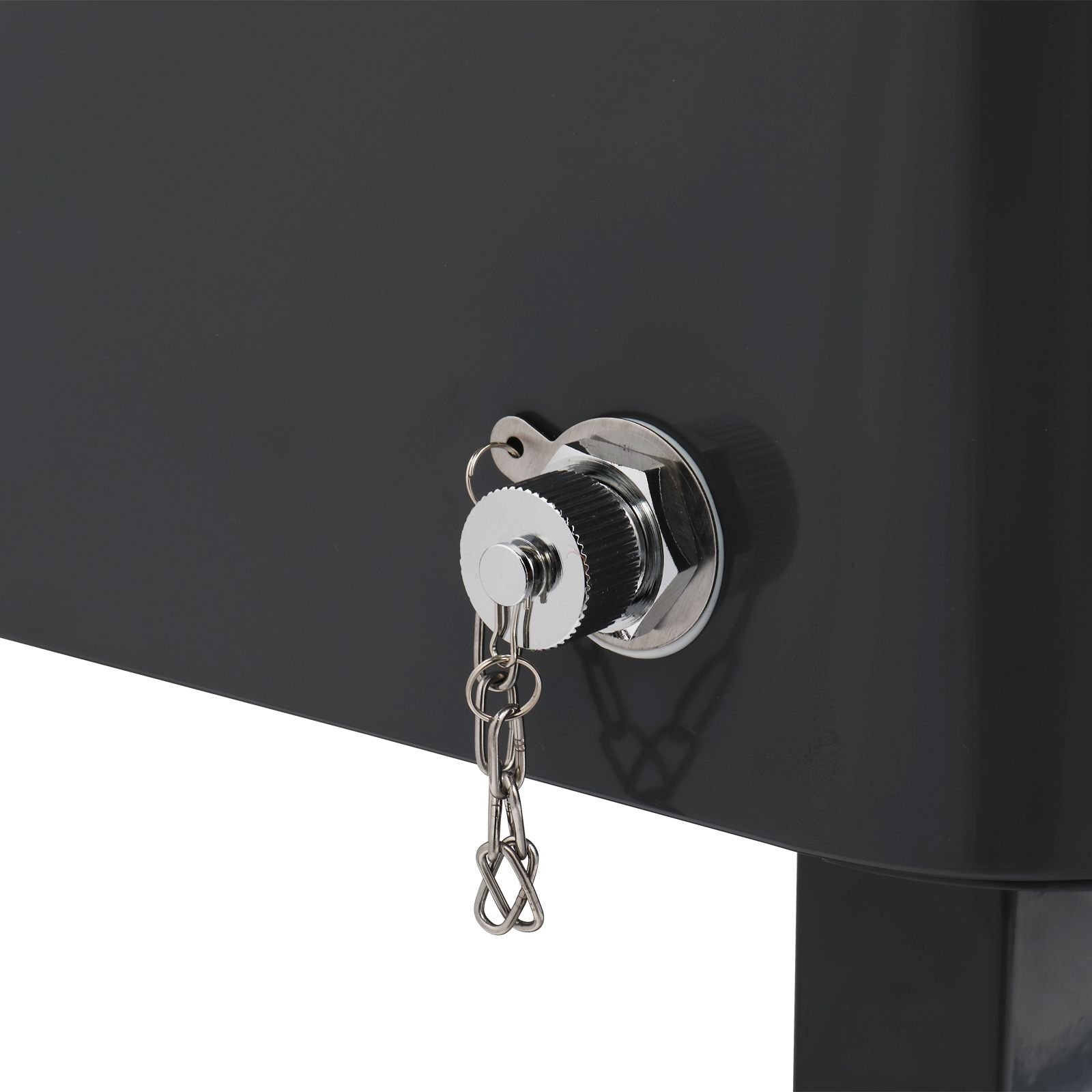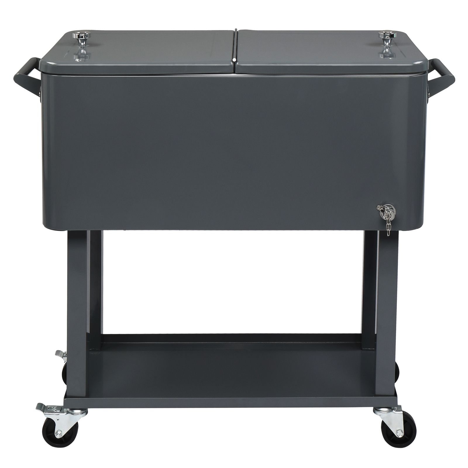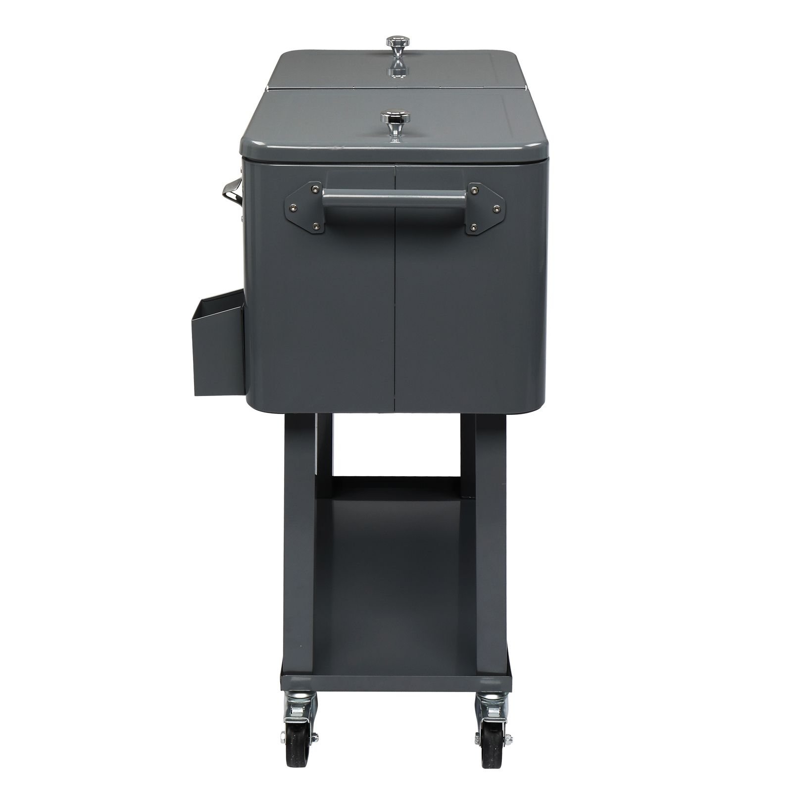 Level up your outdoor events with an all-in-one cooler cart! Fit all the cool refreshments you need with a large, 80-quart fill capacity, and the lower shelf provides extra space for extra beverages or other items you wish to store. Its insulated basin keeps your beverages cold for multiple hours with its injected molded insulation technology. The bottle opener and cap catcher help you easily remove and collect the caps, and the sturdy wheels provide easy mobility when the cooler is full with its locking casters. The drainage cap make it so convenient to clean up the cooler in a nap. Entertain yourself and your guests with this beautiful and high-quality rolling cooler cart!