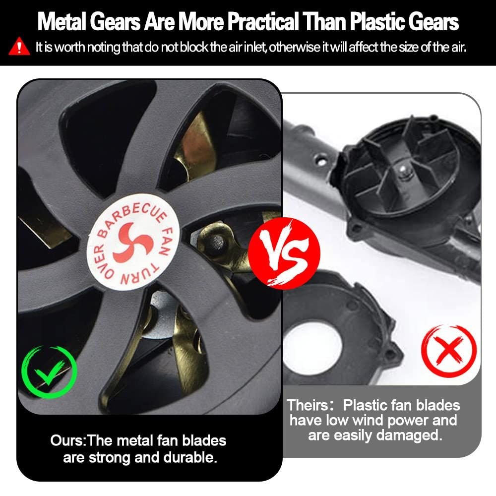 Our BBQ blower is made of plastic body and metal air outlet; which has good impact resistance and heat resistance; not easy to damage; not easy to rust; and can withstand more force. In addition; the inside of the blower is made of high-quality stainless steel; and the metal gears are smoother and more durable than plastic gears.