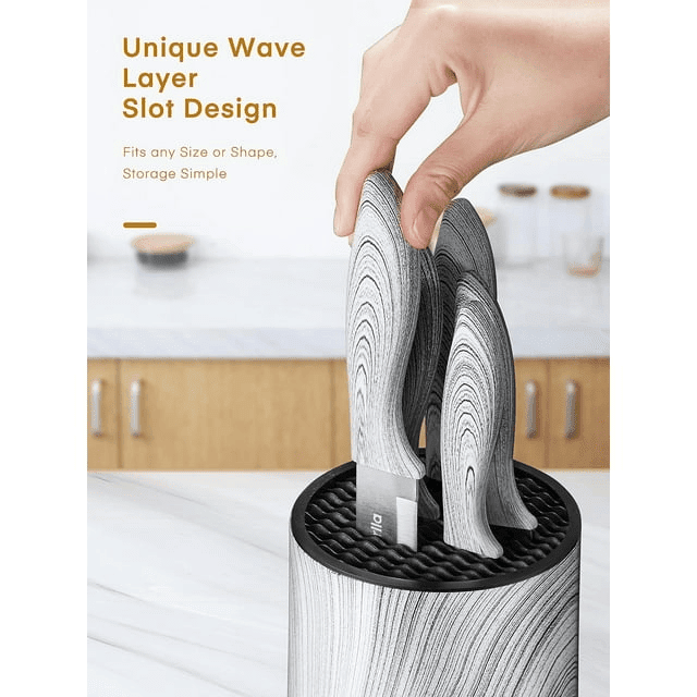 This d.Perlla knife set, 6 pieces kitchen knife set with detachable round upright knife cylinder, knives set with marble pattern handles design, modern & stylish, for easy cleaning and drying. Ergonomically and softly designed handles provide a comfortable grip during use. This premium knife block set comes with the following 5 kitchen knives and a block: 8" chef knife, 8" bread knife, 8" carving knife, 5" utility knife, 3.5" paring knife and a striped marble texture block. The knife holder inner layer adopts double ripple slot design, which can makes the knife body stand upright without shaking and stable. Even if the knife holder is turned over, the knife will not fall out, and you can take knife out easily.