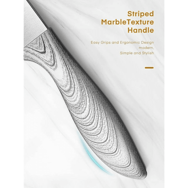 The knife set including -- 8" chef knife, 8" bread knife, 8" carving knife, 5" utility knife, 3.5" paring knife, and a striped marble texture block.