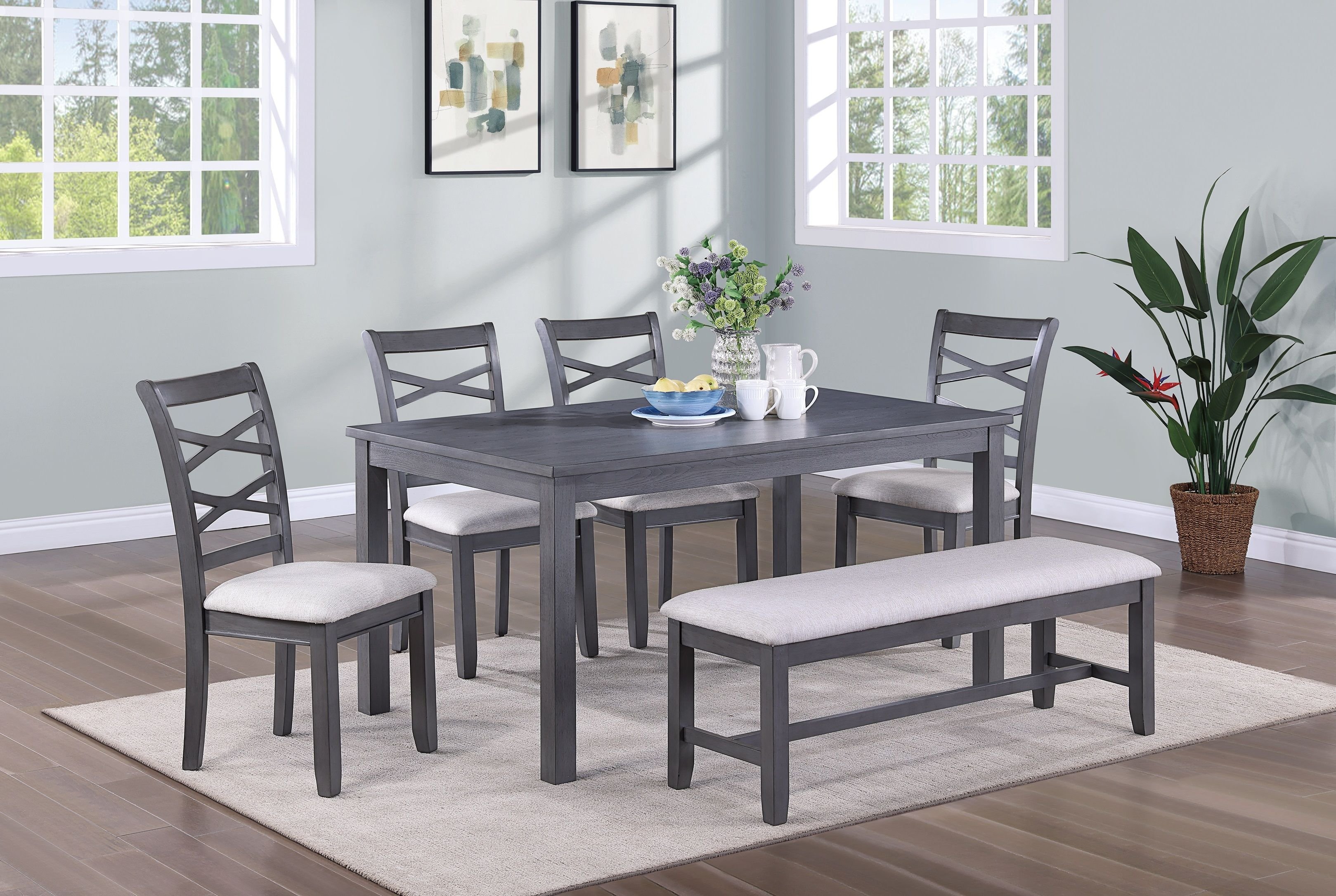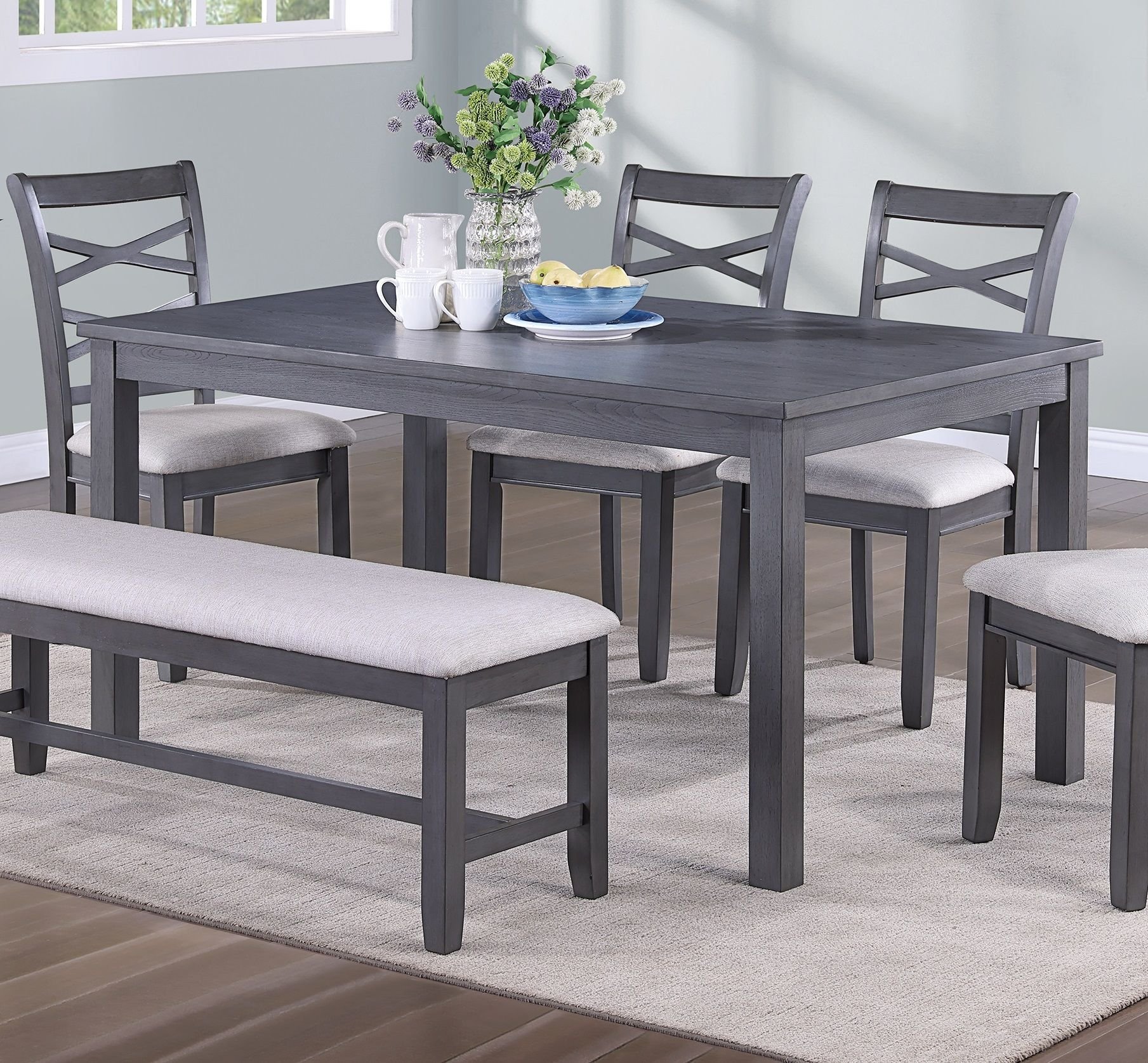 We love the simple design of this 6-piece dining set, consisting of a table, four upholstered chairs, and an upholstered bench. The rectangular table has a generous 60 long surface and stands on four aligned legs. Upholstered cross-back chairs are such a classic, while the addition of a comfortably cushioned bench brings a modern sensibility to the table. This dining set creates a welcoming gathering place for family dinners and get-togethers with friends.