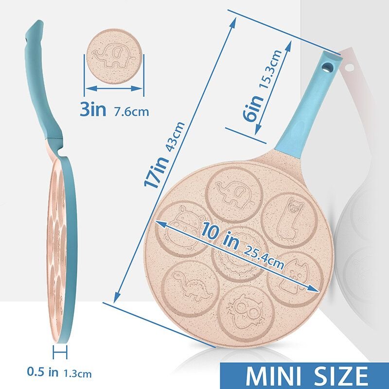 Nonsticky Pan Coating- Our pan is coated with 100% PFOA free non-stick coating in cute healing color, not only baking for teenagers and kids but also make yourself relaxing when you flip those pancakes 7 Pancake Maker - 3-Inch flapjack pancake maker for blinis and crepes in fun shapes with this holiday pancakes molds. 7 pancake mood : Elephant, Alpaca, Cat,owl, Dinosaur, hippo, lion PREMIUM MATERIAL: Made of die cast Aluminum, 10 inches diameter and 1/2 inches height, each cavity measure 3 inches. 17 Inches length including the silicone handle BROAD COOK TOP VERSATILITY: Heavy duty pan works on Gas, Halogen, Ceramic Cook tops, stove grill ; Use for pancakes, crepes, blinis & blintzes Induction Cook tops Not Applicable ! Do not put in dishwasher as it will shorten the life of the nonstick coating on the pan and may dull the exterior of the pan