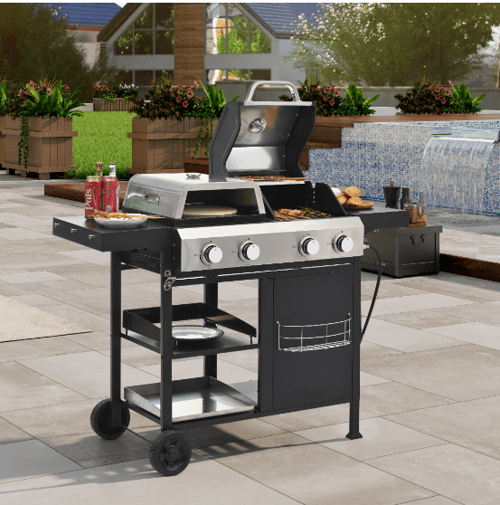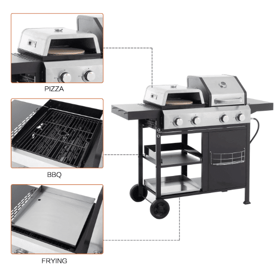 Combination Design: A combination of a gas grill and frying pan with two separate cooking zones with 233 square inches of cooking space each for a total cooking space of 466 square inches, over 4 burners, and an output of 49,200 BTU.