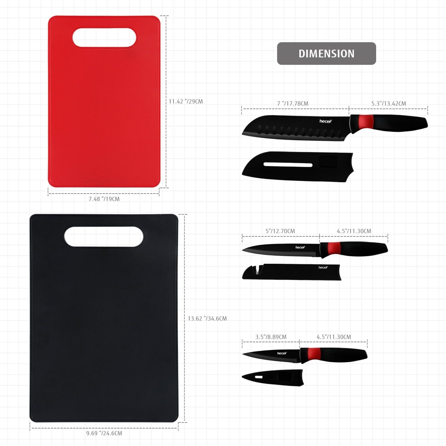 Hecef 8-piece All-in-one Handy Kitchen Knife and Board Set - includes 7" Santoku knife, 5" Utility knife, 3.5" Paring knife with 3 matching blade guards, a small red plastic cutting mat and a large black cutting mat, which makes any kitchen more practical. Saving your space and money all at the same time. They are light and easy to carry, very good for outdoor camping. This Patented Thumb Massage Designed knife set has been fully developed, patented, and certified. No more fatiguing or straining hands! Our chopping mats are made by pp material, which is a durable, non-toxic and non-corrosion material that hardly takes apart. With a built-in tungsten steel knife sharpener design, you only need a few pulls to restore the cutting edge to a'V'shape. A modern, elegant gift idea to help make any kitchen more practical. What makes this gift even more appealing is the fact that it comes with all the knives and cutting mats you need in the kitchen, which is perfect for New Home, Birthdays, Christmas, for Her or for Him.