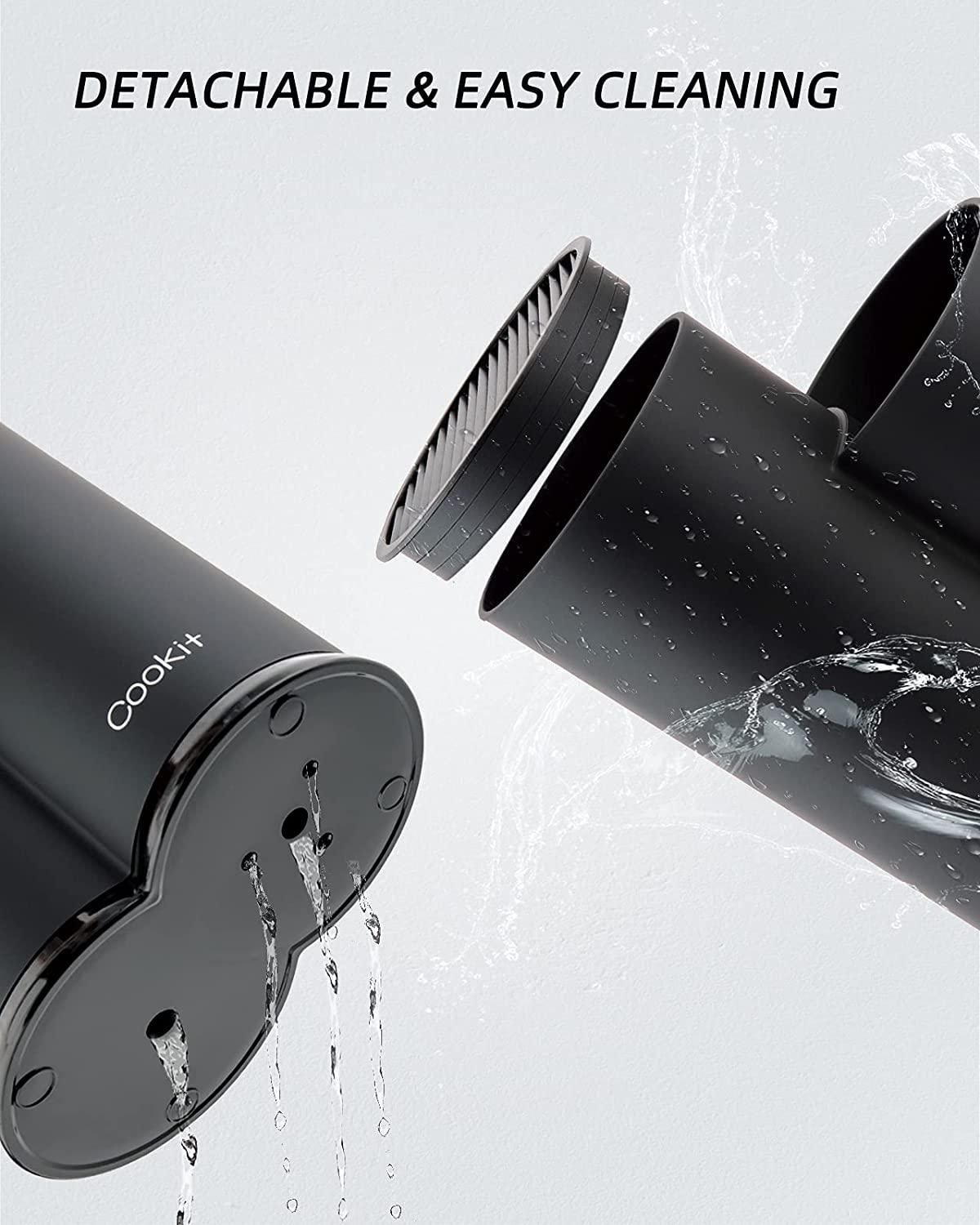 The knife block top is detachable with drainage holes; it can be washed easily and dry fast. The weight gaining bottom enhances the stability when removing the knife and avoid scratching the counter