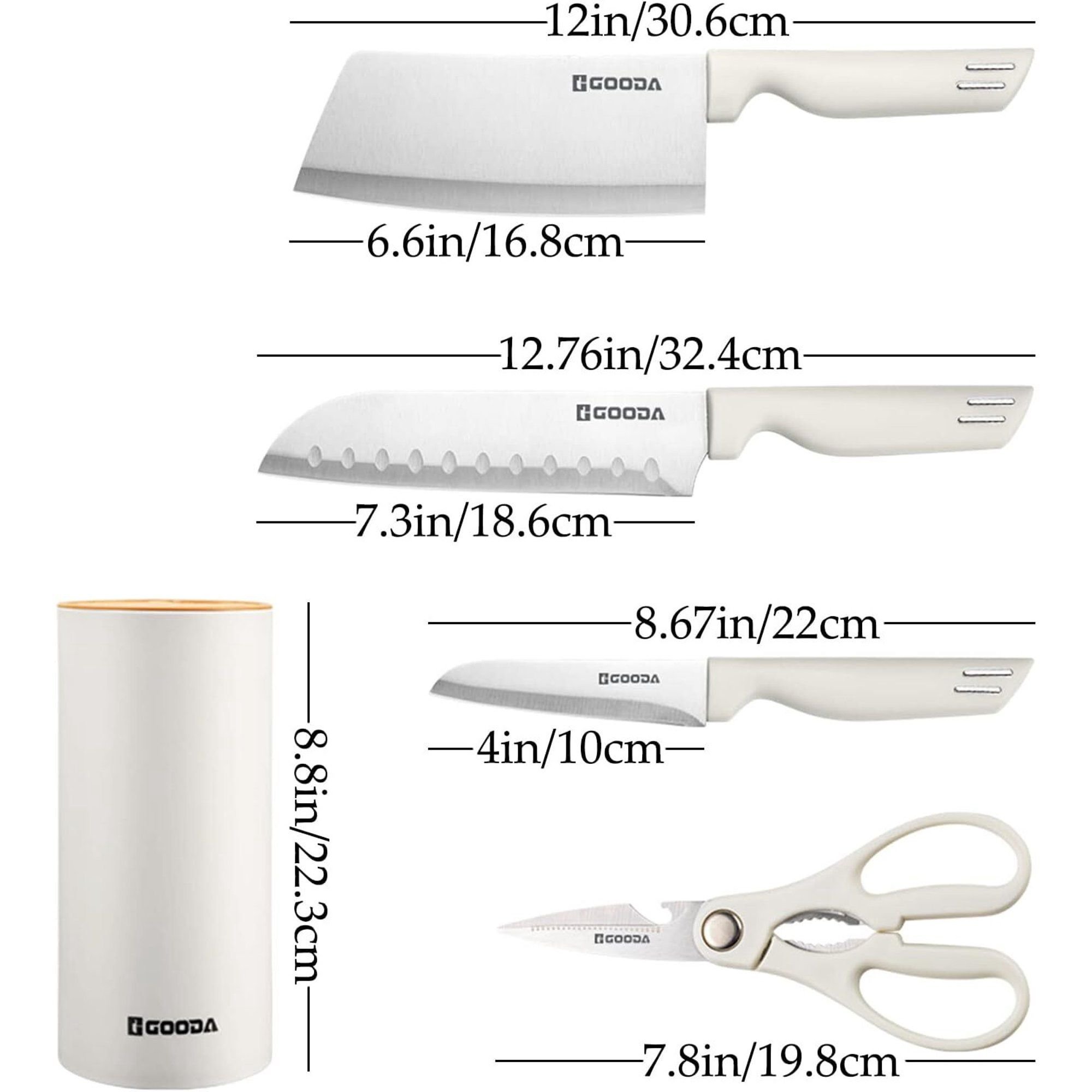 【Knife Block Set】This white multifunctional kitchen knife set of 5 includes: 6.6" cleaver knife, 7.3" chef knife, 4" fruit knife, 7.8" kitchen scissors, 8.8" knife holder. Suitable for cutting, chopping, dicing, slicing, easily helping you cut meat, beef, vegetables, fruits and other foods. Cutter set necessary for kitchen.
