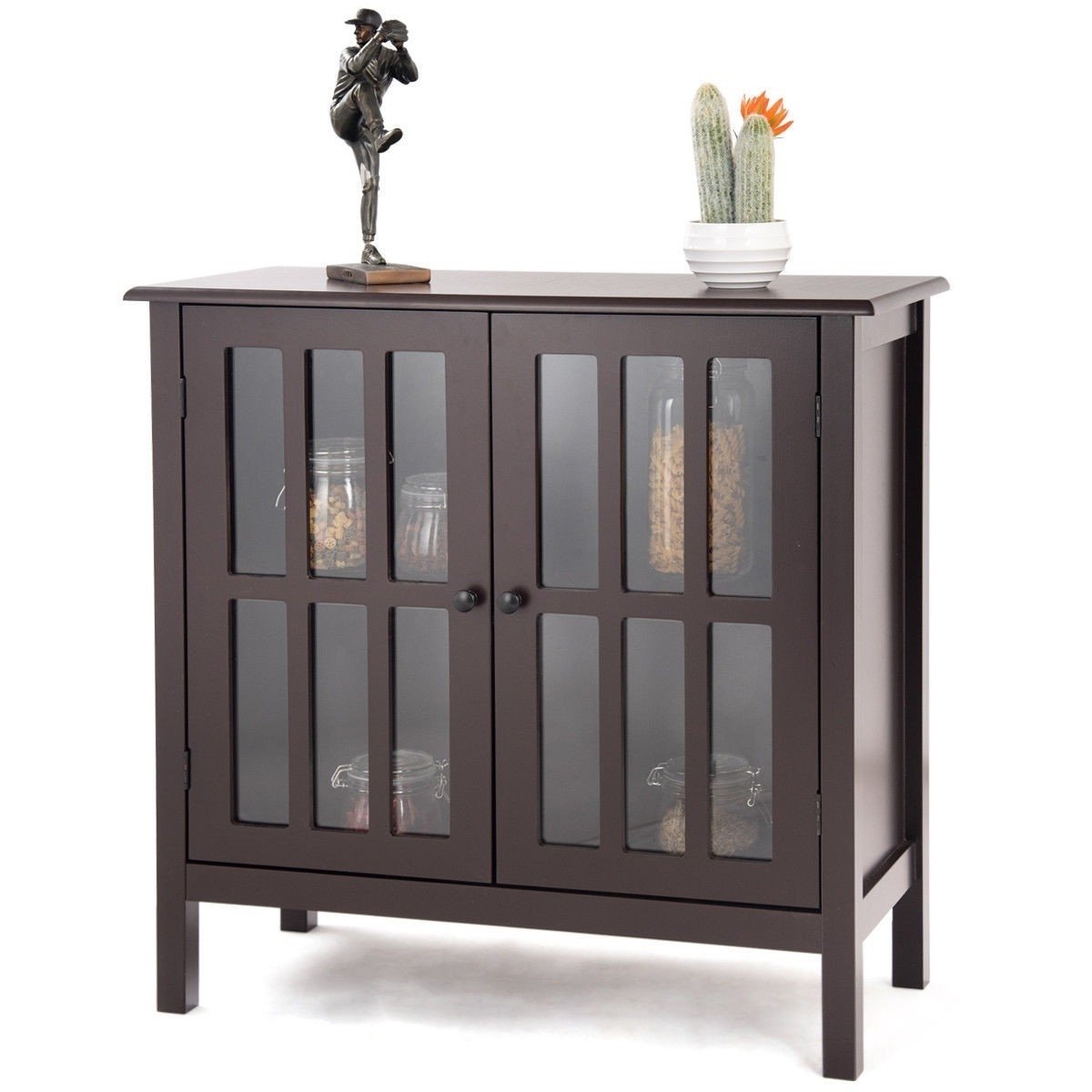 • Brown Wood Sideboard Buffet Cabinet with Glass Panel Doors
