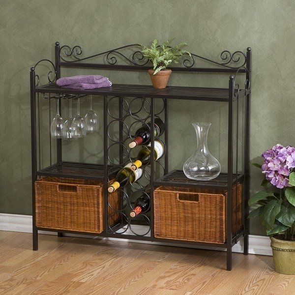 This Kitchen Dining Baker's Rack with Wine Storage and Rattan Baskets will improve storage, display and organization. Also, it features two lower hand-stained rattan baskets.