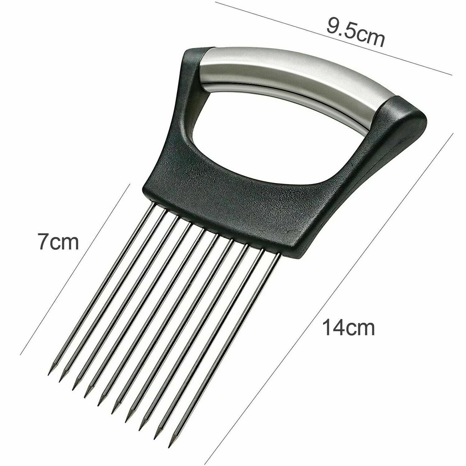 4.Onion Holder pushes easily into onions for appealing uniform slices. With sharp stainless steel fork tines and an extra wide handle.