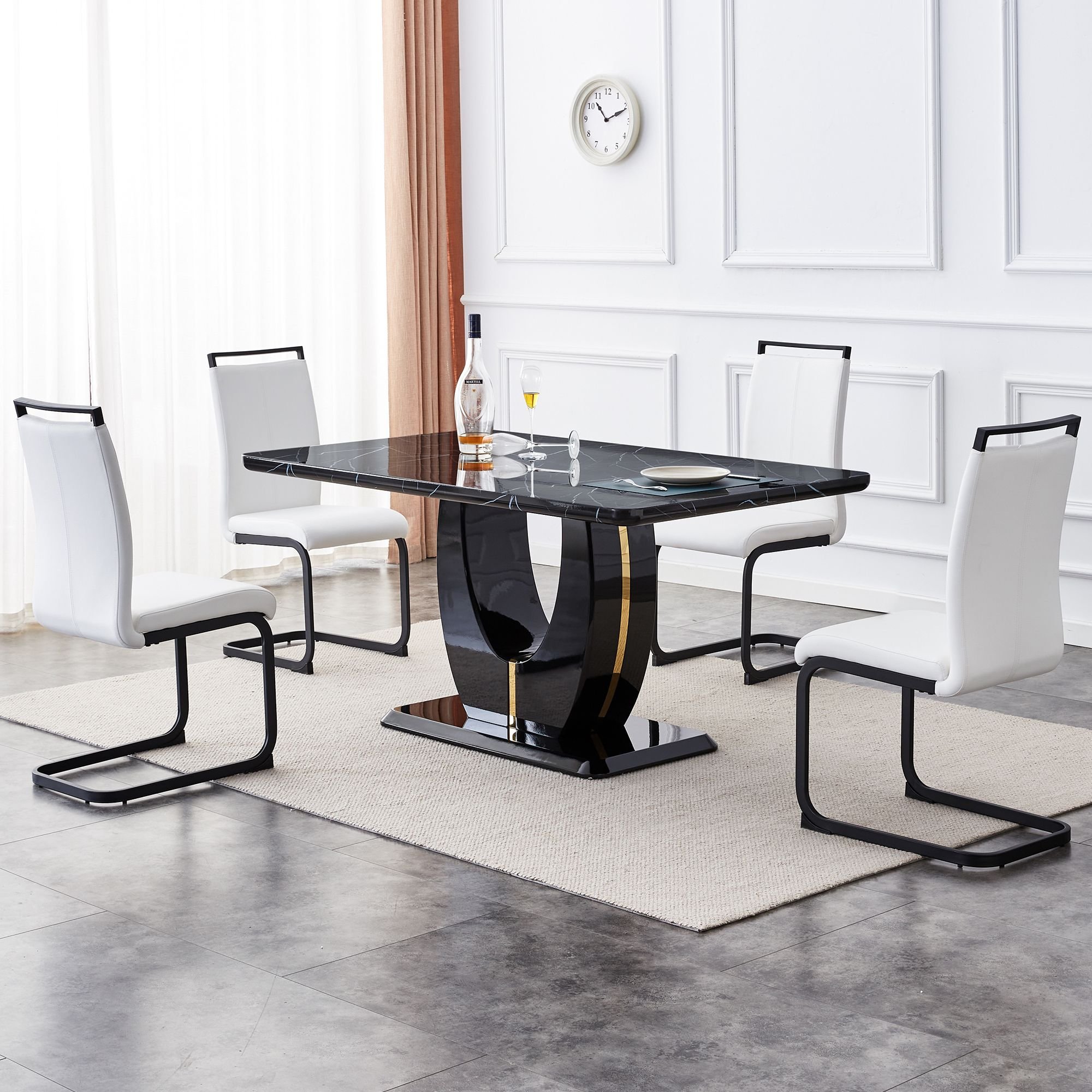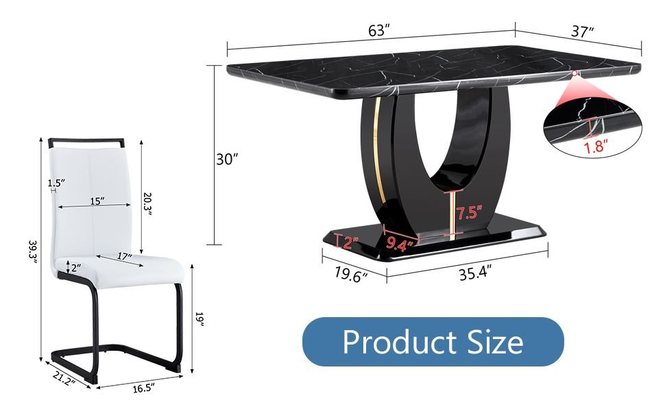 Black and White Pattern Tabletop: The dining table is made of MDF material with a thickness of 1.8 inches, featuring a black base color with a white line texture sticker, showcasing a stylish and elegant combination.