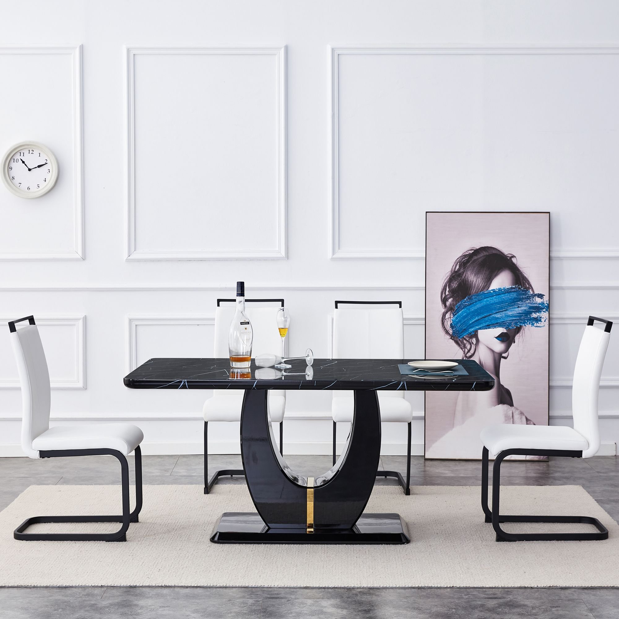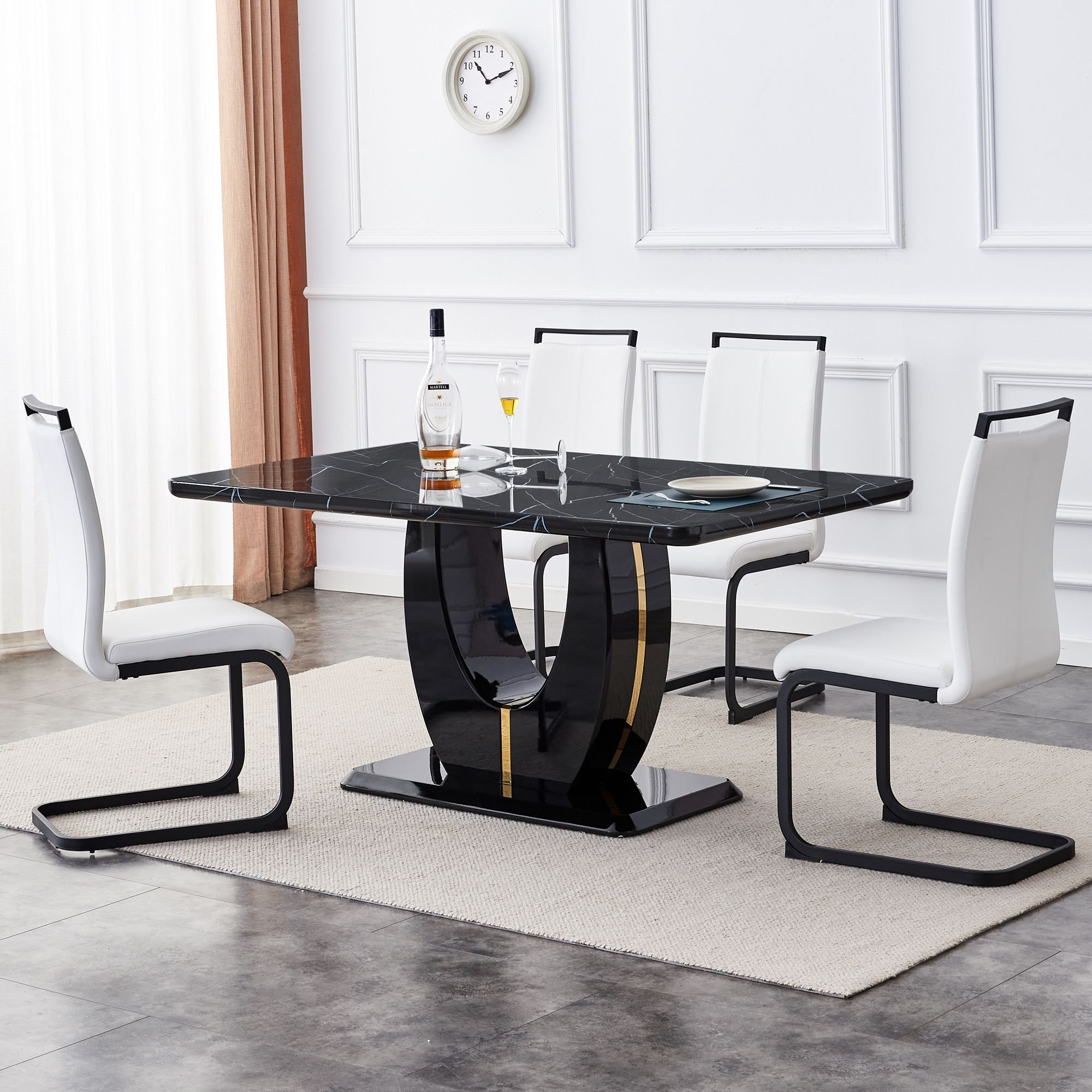 The table legs are made of MDF, sprayed with black high-gloss paint, and decorated with stainless steel gold plating strips, fashionable and elegant.The legs are designed in a U-shape to provide stable support, capable of holding up to 300 pounds.
