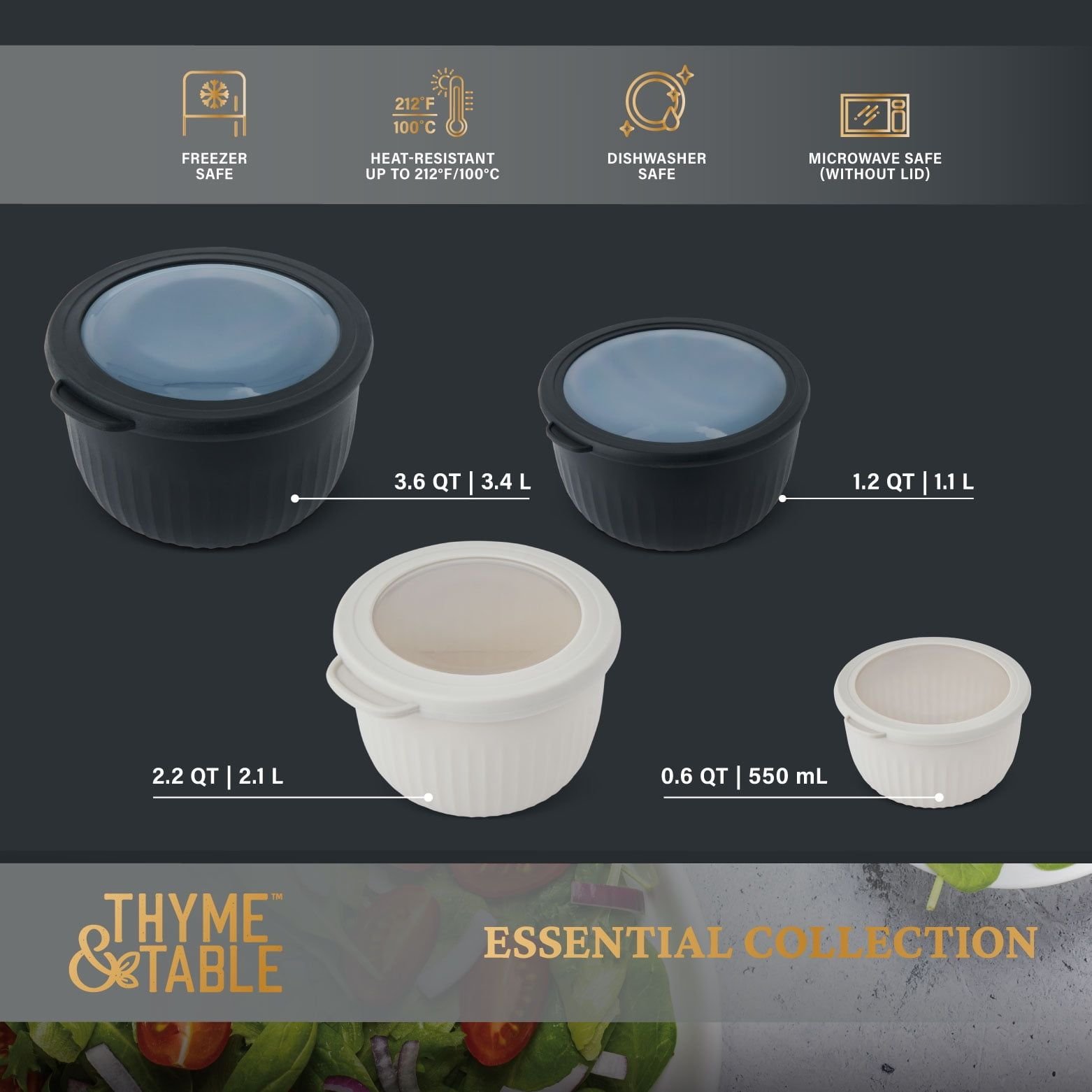 Introducing the Thyme & Table 8-Piece Mixing Bowl Set, a stylish and versatile addition to your kitchen. This comprehensive set features four mixing bowls in a contemporary black and cream color scheme, perfectly complementing any kitchen decor. With sizes ranging from 0.6 quart to 3.6 quarts, these bowls cater to all your culinary needs. Each bowl comes with a matching easy-grip lid, ensuring seamless transitions from mixing to storage, while also being heat resistant up to 212°F for added convenience. The nesting function allows for compact storage, optimizing space in your kitchen cabinets. Whether you're whisking, stirring, or storing leftovers, the Thyme & Table Mixing Bowl Set offers the durability and functionality you need to excel in the kitchen. Elevate your cooking experience with this essential set that combines style, versatility, and practicality.