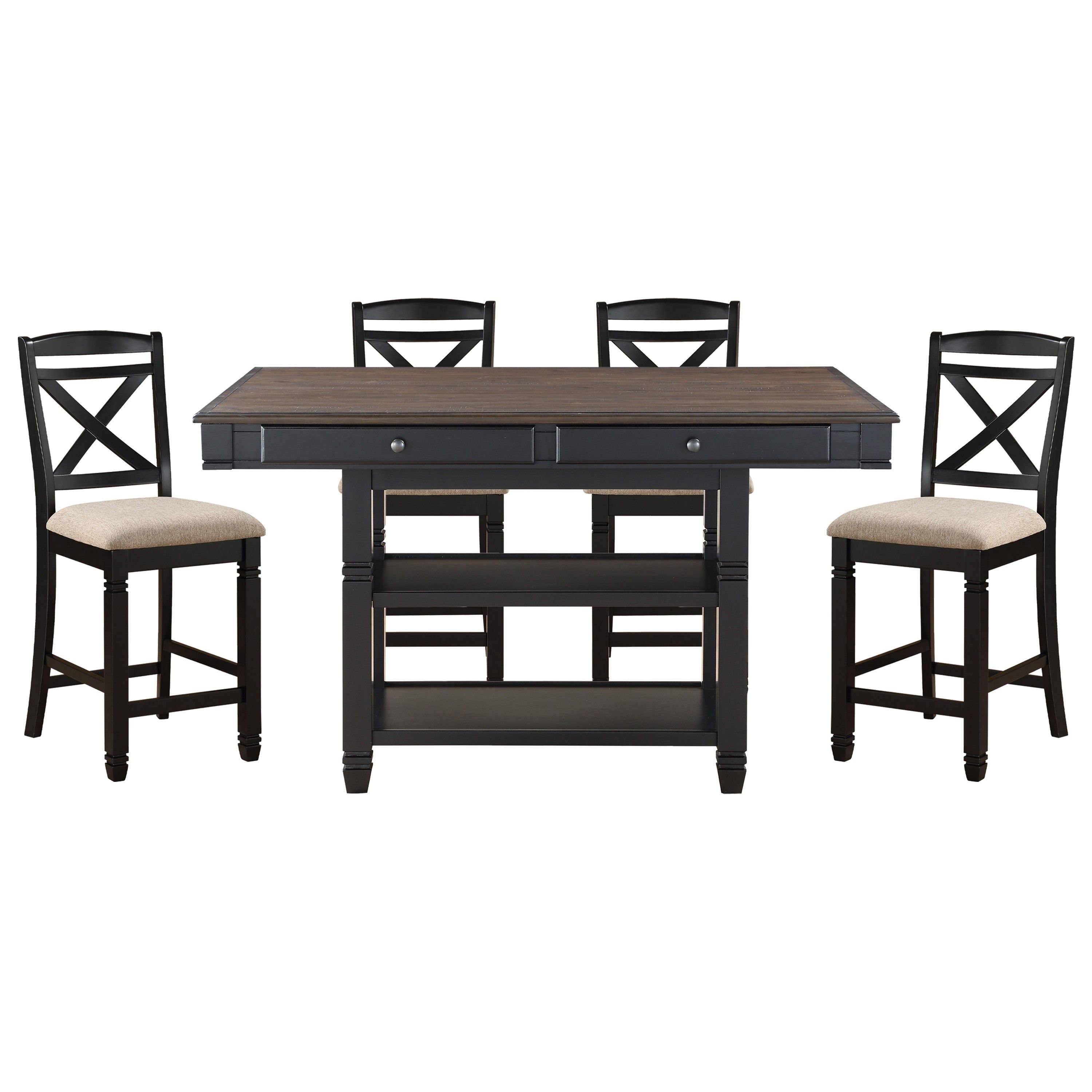 Transitional Style Counter Height Dining Set 5pc Table w Display Shelves Drawers and 4x Counter Height Chairs Black Finish Funiture