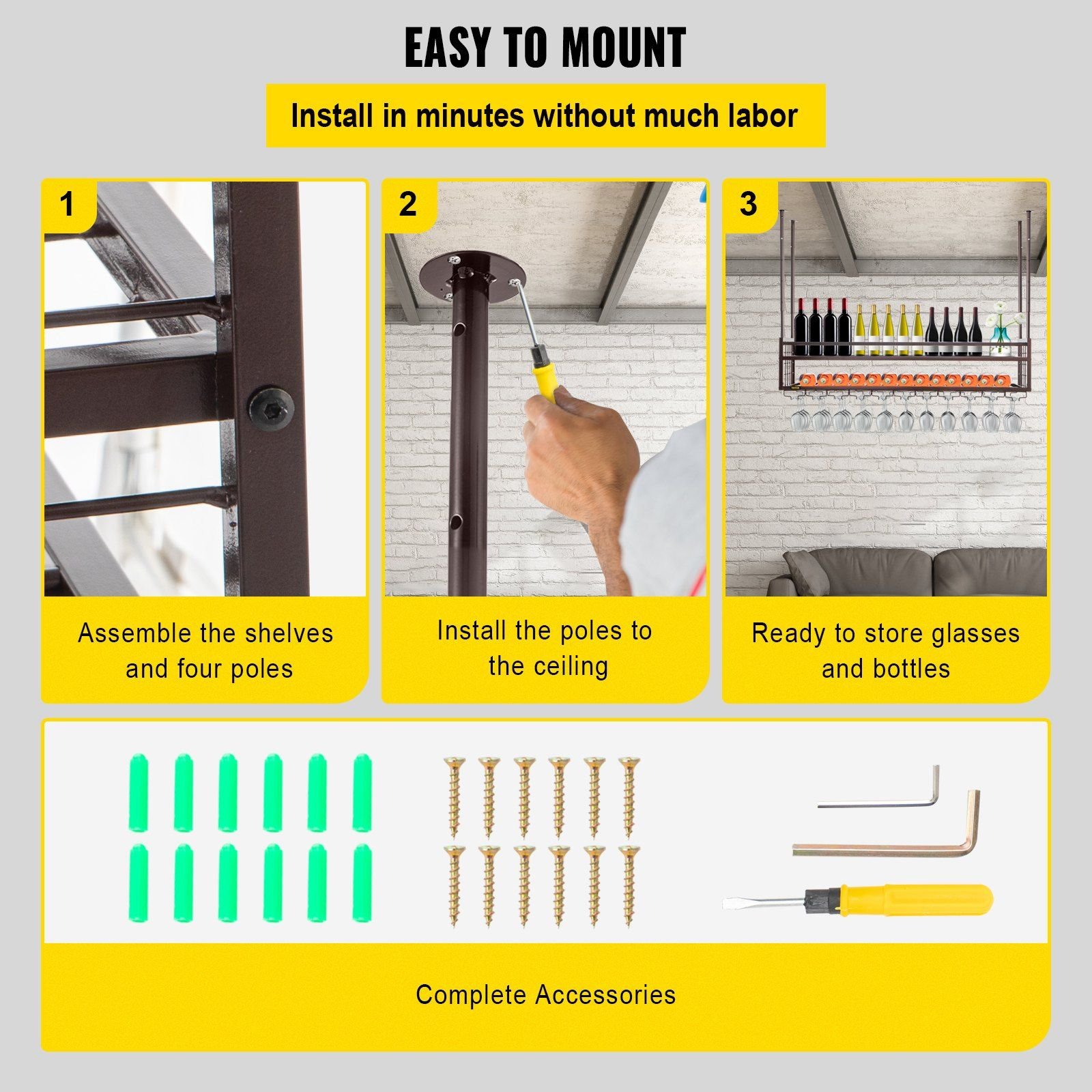 4.Convenient Installation: The simplified structure allows you to assemble this wine glass rack effortlessly, saving you a lot of time and energy. It only requires you to install the four poles and the shelf by tightening the screws, and then you need to fix the whole rack to the ceiling through the pre-drilled holes on the top of the poles. After that, our hanging rack is ready to put your wine bottles and glasses.