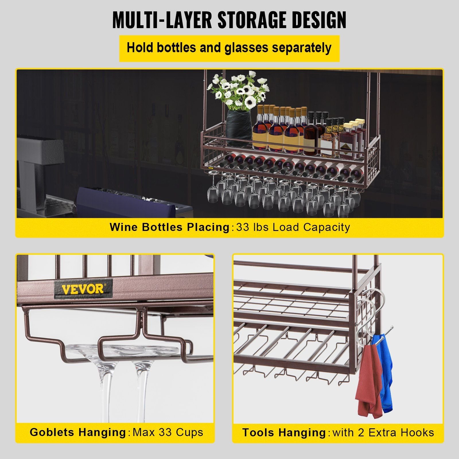 This multifunctional wine bottle rack can be used to hang up to 33 glasses on the bottom of the rack and store wines on the upper shelf. The heavy-duty rack can hold a maximum of 33 pounds of items. Besides, the 2 hooks as gifts are suitable for hanging tools like cleaning cloths or bottle openers.