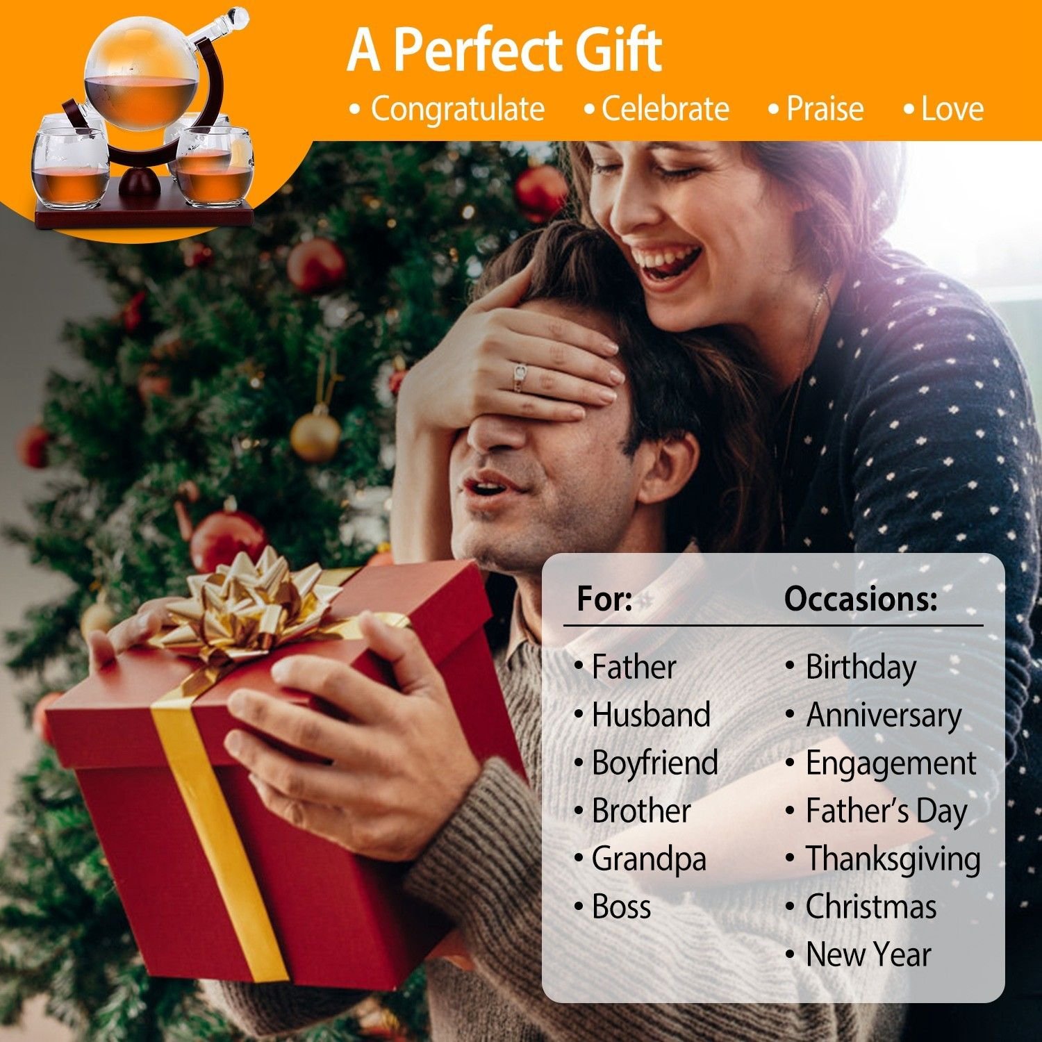 *Beautiful Decoration*:Unique complete elegant whiskey decanter set; includes an globe design decanter and unique antique ship inside; accompanied by four matching classic glasses masterly and a OSB wooden tray; which can perfectly decorate your home or enhance your bar.